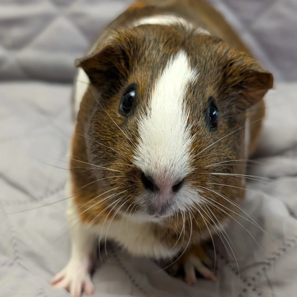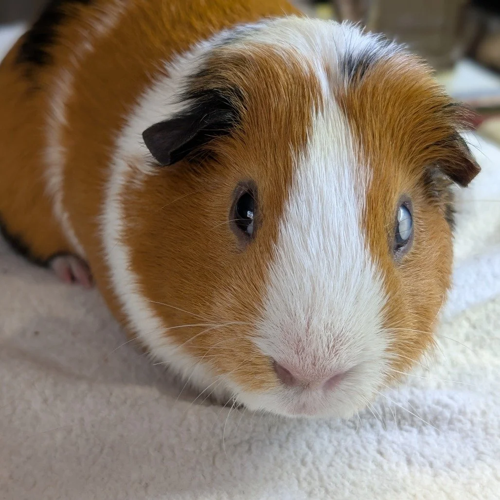 Fun Fact: Rupert & Neil were part of a group of 14 guinea pigs abandoned in a box in a local park in early 2024. All of the guinea pigs were emaciated and suffering from scurvy (vitamin C deficiency). Rupert was covered in bite wound from the other males. His right eye was missing and the eye socket was severely infected. They both have permanent dental issues and require ongoing specialized care. -